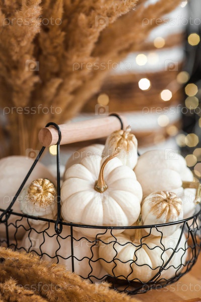 Натюрморт. Белые декоративные тыквы в железной чердачной корзине на столе в домашнем интерьере гостиной на фоне красивого бокового света. Концепция уютной осени