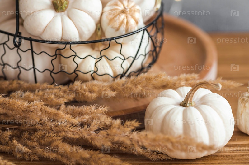 Натюрморт. Белые декоративные тыквы в железной чердачной корзине на столе в домашнем интерьере гостиной на фоне красивого бокового света. Концепция уютной осени