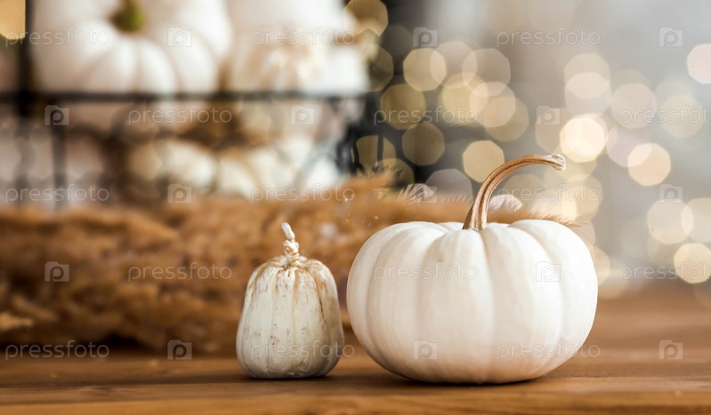 Натюрморт. Белые декоративные тыквы на столе в домашнем интерьере гостиной на фоне красивого бокового света. Концепция уютной осени