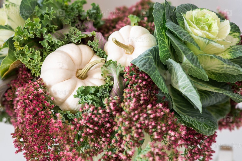 Натюрморт. Букет декоративной капусты в вазе и тыквы в интерьере домашней кухни. Уютная осенняя концепция