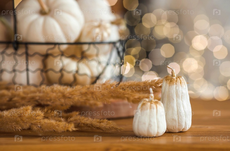 Натюрморт. Белые декоративные тыквы на столе в домашнем интерьере гостиной на фоне красивого бокового света. Концепция уютной осени