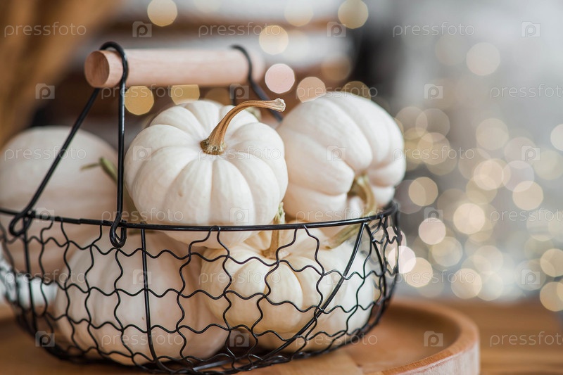Натюрморт. Белые декоративные тыквы в железной чердачной корзине на столе в домашнем интерьере гостиной на фоне красивого бокового света. Концепция уютной осени