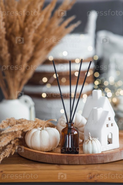 Аромадиффузор. Осенние ароматизированные духи для дома в стеклянном флаконе с палочками в качестве освежителя воздуха в доме и тыквами. Ароматерапия, уютная атмосфера, комфорт и расслабление