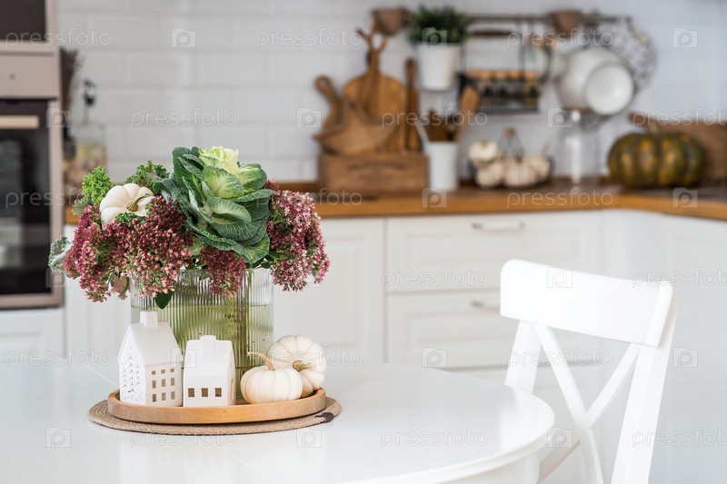 Натюрморт. Букет декоративной капусты в вазе, тыквы и белые домики на столе в интерьере домашней кухни. Уютная осенняя концепция