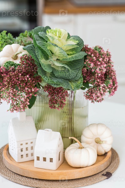 Натюрморт. Букет декоративной капусты в вазе, тыквы и белые домики на столе в интерьере домашней кухни. Уютная осенняя концепция