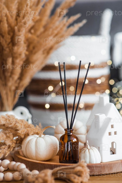Аромадиффузор. Осенние ароматизированные духи для дома в стеклянном флаконе с палочками в качестве освежителя воздуха в доме и тыквами. Ароматерапия, уютная атмосфера, комфорт и расслабление