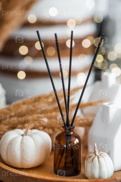 Аромадиффузор. Осенние ароматизированные духи для дома в стеклянном флаконе с палочками в качестве освежителя воздуха в доме и тыквами. Ароматерапия, уютная атмосфера, комфорт и расслабление