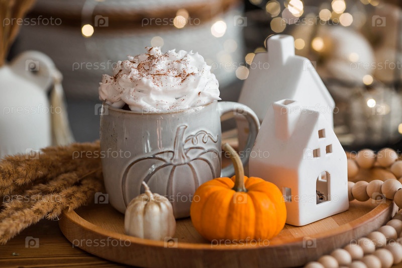 Вкусный тыквенный латте со взбитыми сливками и корицей в кружке на столе в интерьере гостиной. Осенний декор в доме. Скандинавский стиль