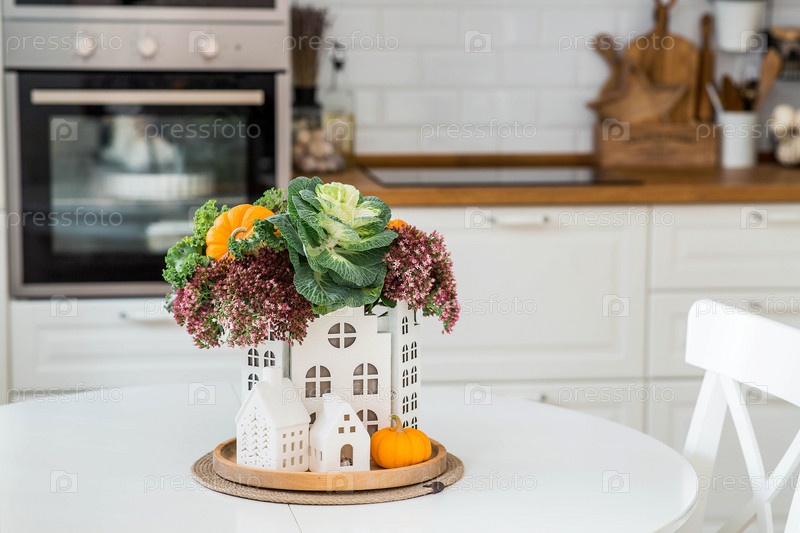 Натюрморт. Букет декоративной капусты в вазе, тыквы и белые домики на столе в интерьере домашней кухни. Уютная осенняя концепция
