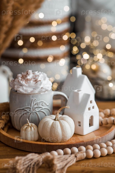 Вкусный тыквенный латте со взбитыми сливками и корицей в кружке на столе в интерьере гостиной. Осенний декор в доме. Скандинавский стиль