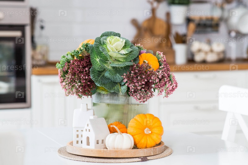 Натюрморт. Букет декоративной капусты в вазе, тыквы и белые домики на столе в интерьере домашней кухни. Уютная осенняя концепция