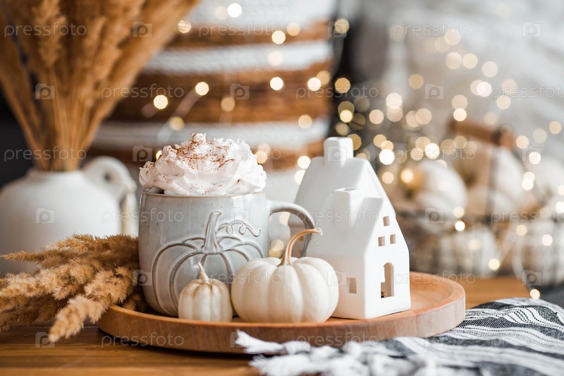 Вкусный тыквенный латте со взбитыми сливками и корицей в кружке на столе в интерьере гостиной. Осенний декор в доме. Скандинавский стиль