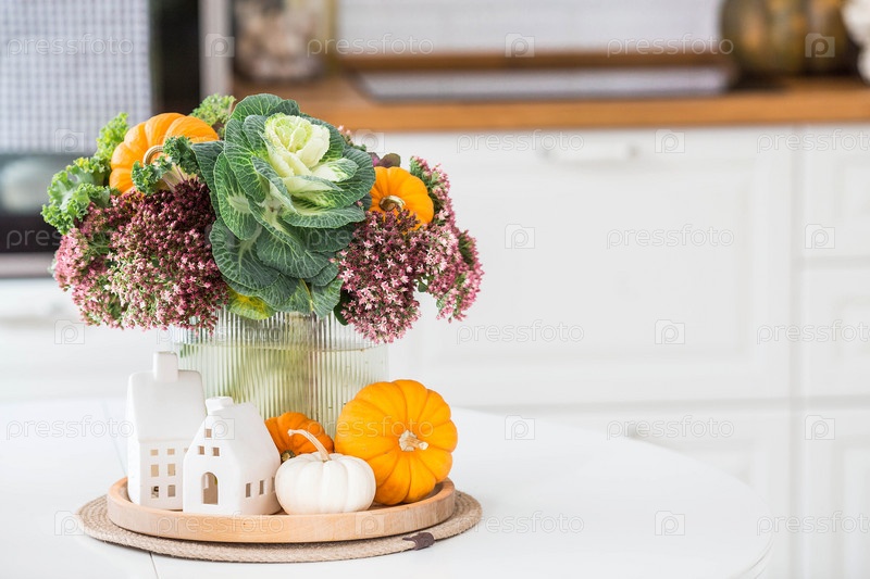Натюрморт. Букет декоративной капусты в вазе, тыквы и белые домики на столе в интерьере домашней кухни. Уютная осенняя концепция