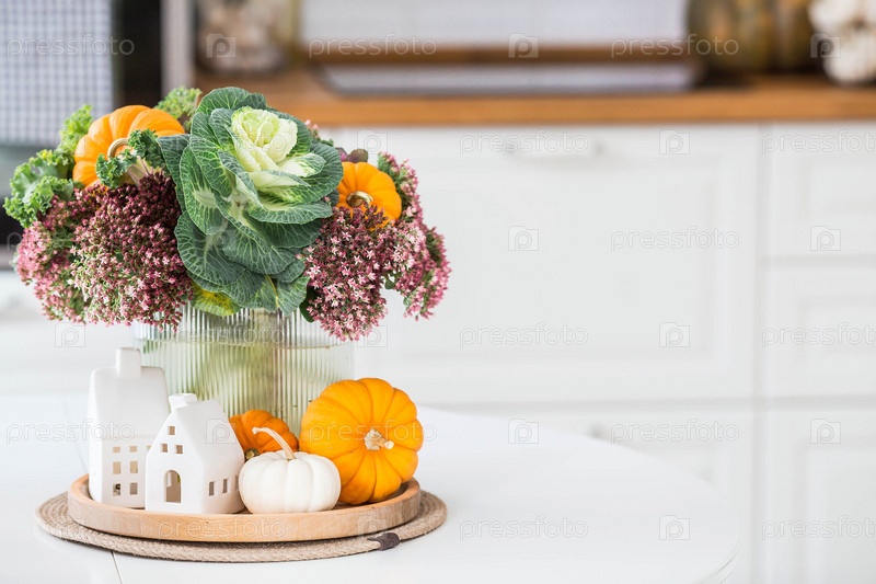 Натюрморт. Букет декоративной капусты в вазе, тыквы и белые домики на столе в интерьере домашней кухни. Уютная осенняя концепция