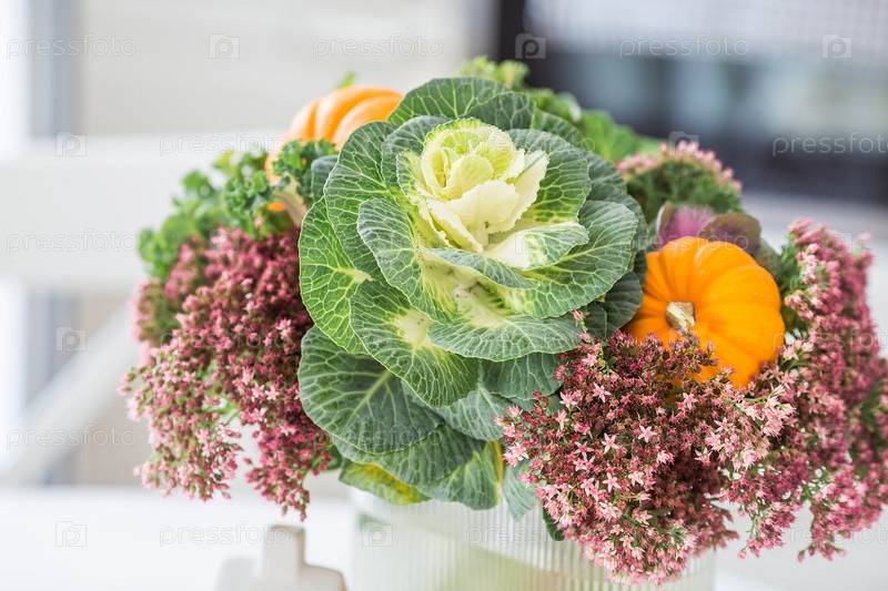 Натюрморт. Букет декоративной капусты в вазе и тыквы в интерьере домашней кухни. Уютная осенняя концепция