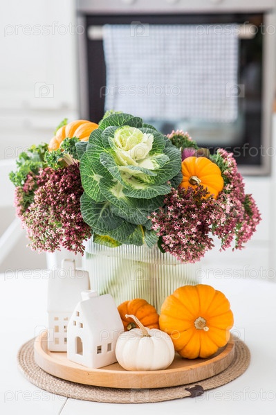 Натюрморт. Букет декоративной капусты в вазе, тыквы и белые домики на столе в интерьере домашней кухни. Уютная осенняя концепция