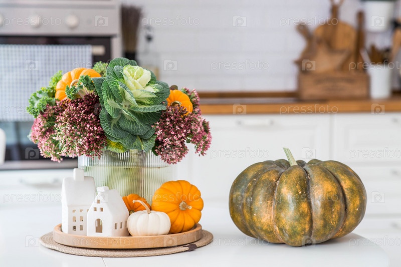 Натюрморт. Букет декоративной капусты в вазе, тыквы и белые домики на столе в интерьере домашней кухни. Уютная осенняя концепция