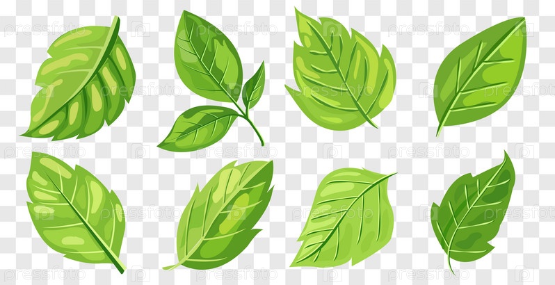 С восемью различными типами зеленых листьев. Каждый лист демонстрирует уникальные формы и узоры прожилок. Графика простая, чистая и яркая, идеально подходит для дизайнов на природную тематику и экологически чистых проектов