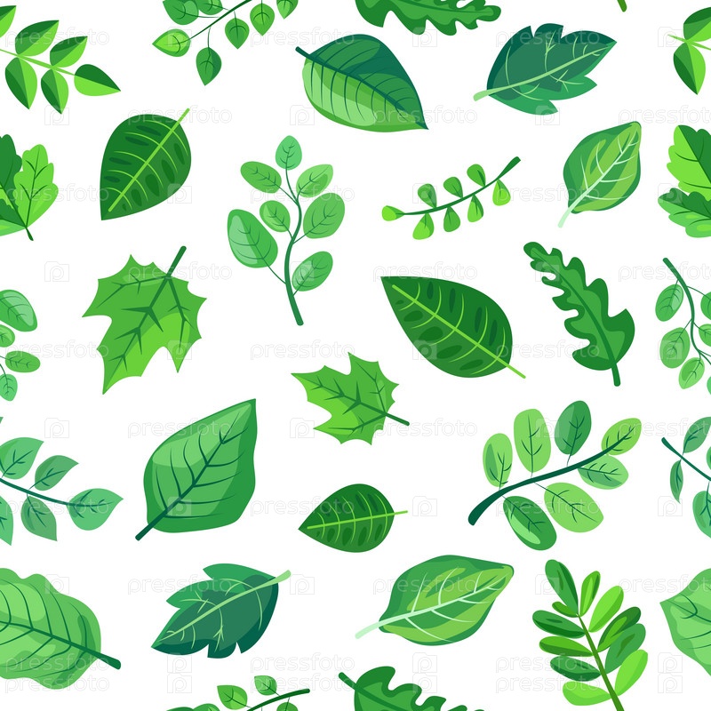 Бесшовный узор с различными оттенками и формами зеленых листьев на белом фоне. Идеально подходит для дизайна на природную тематику, экологичной упаковки и ботанических иллюстраций