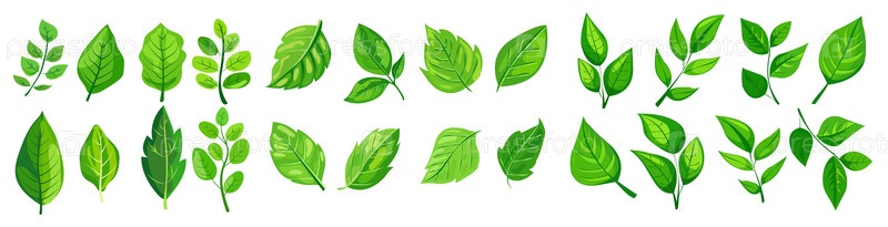 С восемью различными типами зеленых листьев. Каждый лист демонстрирует уникальные формы и узоры прожилок. Графика простая, чистая и яркая, идеально подходит для дизайнов на природную тематику и экологически чистых проектов