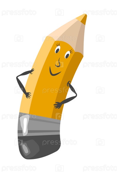 Иллюстрация представляет собой веселого персонажа из желтого карандаша с дружелюбным лицом, с глазами, ресницами и улыбкой. У карандаша черные руки и кисти, что добавляет игривости и оживленности