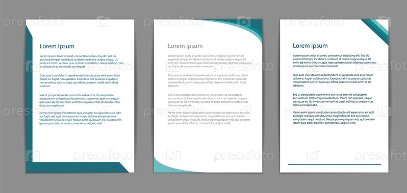 Три белых листа с элементами дизайна цвета бирюзы на сером фоне. Современный макет для деловых документов или отчетов. Профессиональный и чистый вид. шаблон, макет, а4