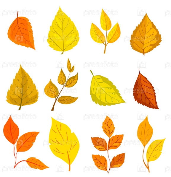 Различные красочные осенние листья разных форм, проиллюстрированные в ярком графическом стиле на белом фоне, представляющие осенний сезон. Векторная иллюстрация