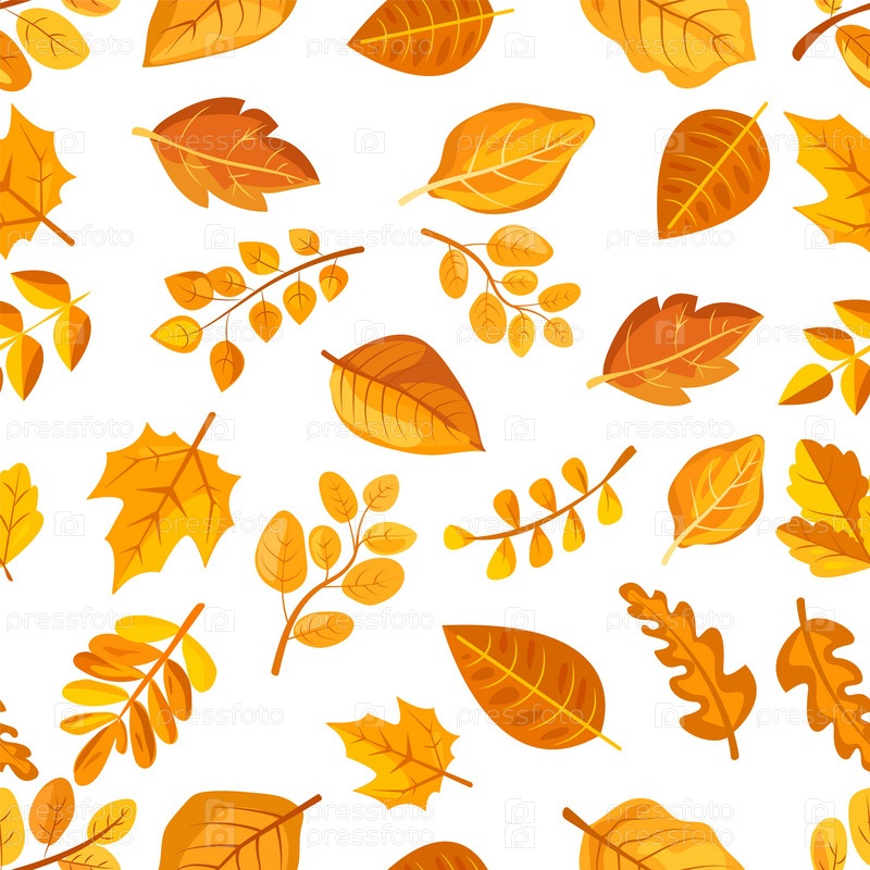 Бесшовный узор из золотых осенних листьев, разбросанных на белом фоне. Красочный графический стиль. Концепция осеннего сезона и красоты природы