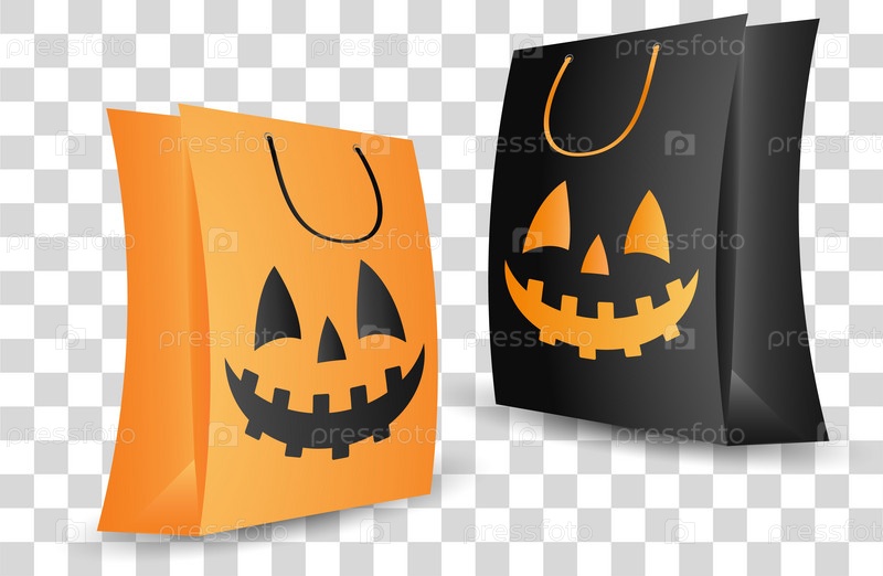 Две сумки для покупок на тему Хэллоуина, одна оранжевая и одна черная, с лицами в виде фонарей Джека. Представлены на прозрачном клетчатом фоне. Концепция покупок на Хэллоуин. Векторная иллюстрация