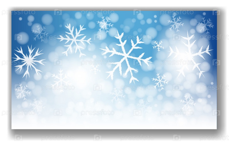 Белые снежинки разных размеров на синем градиентном фоне с эффектом боке. Зимняя праздничная тема, праздничная и холодная концепция сезона. Векторная иллюстрация