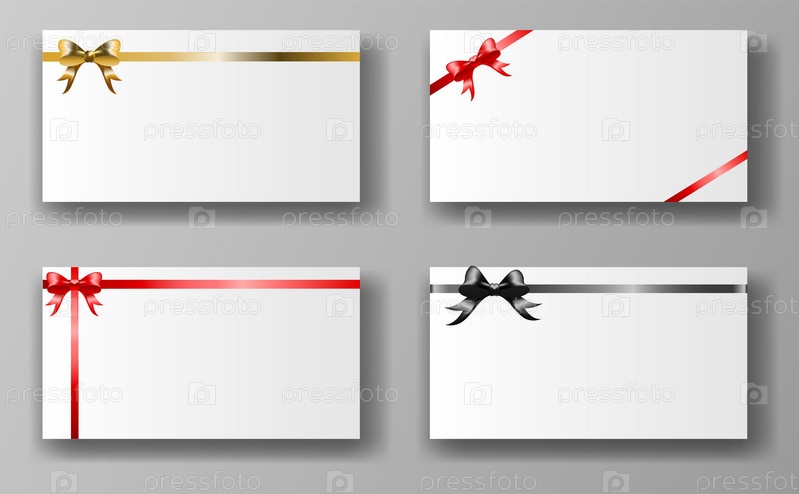 Четыре подарочные карты с бантами в золотом, красном и черном цветах на сером фоне. Каждая карта имеет бант и ленту, что создает праздничный и элегантный вид. Векторная иллюстрация