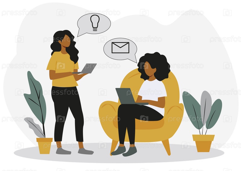 Две женщины используют ноутбуки в домашнем офисе, одна стоит, другая сидит на стуле. Минималистский стиль с растениями на заднем плане. Концепция онлайн-образования и удаленной работы. Вектор