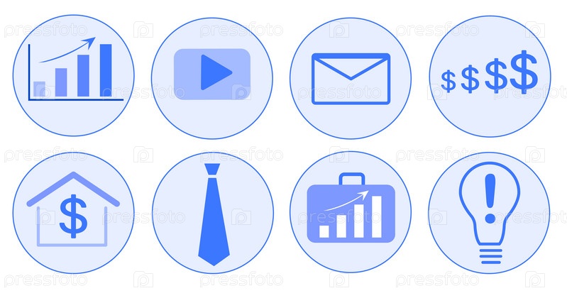 Набор из восьми иконок, связанных с бизнесом, в синих кругах. Иконки включают диаграммы, видео, электронную почту, знаки доллара, дом, галстук, портфель и лампочку, представляющие различные бизнес-концепции