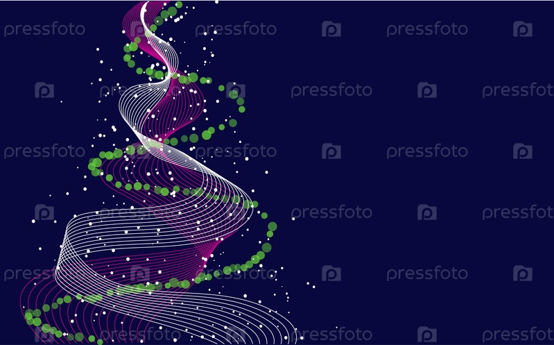 Абстрактный дизайн рождественской елки с красочными линиями и зелеными точками на темно-синем фоне. Изображение передает праздничную и современную концепцию. Векторная иллюстрация
