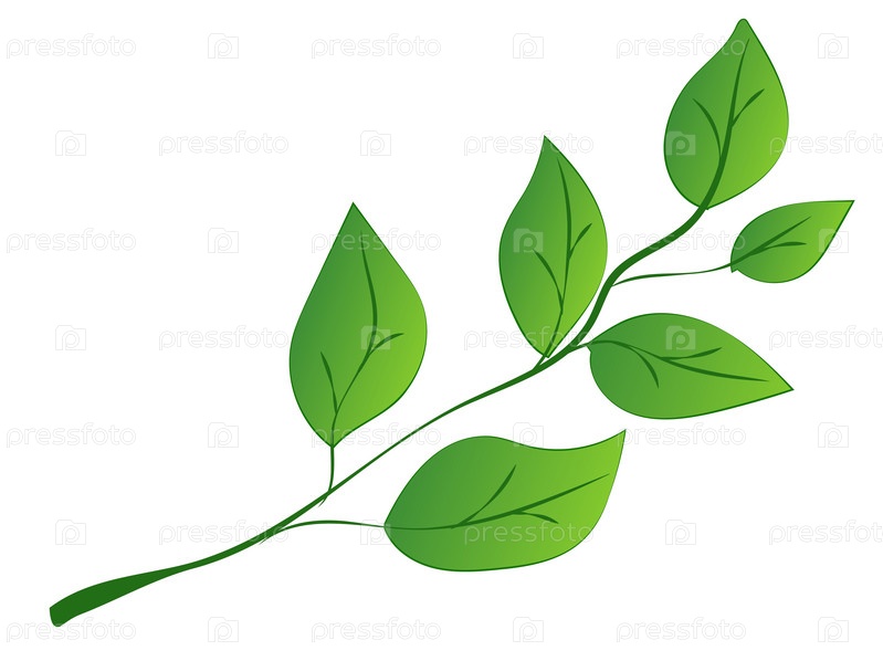 Зеленая лиственная ветка с детализированными листьями, представленная в ярком графическом стиле, на белом фоне. Векторная иллюстрация
