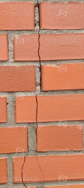 Трещина, скол в кирпичной кладке. Гладкая коричневая стена из красного кирпича. В стене виден дефект - узкая длинная трещина, раскалывающая кирпичи. Серый раствор между кирпичами