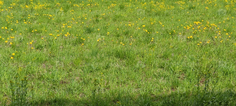 Поляна, заросшая травой и желтыми одуванчиками