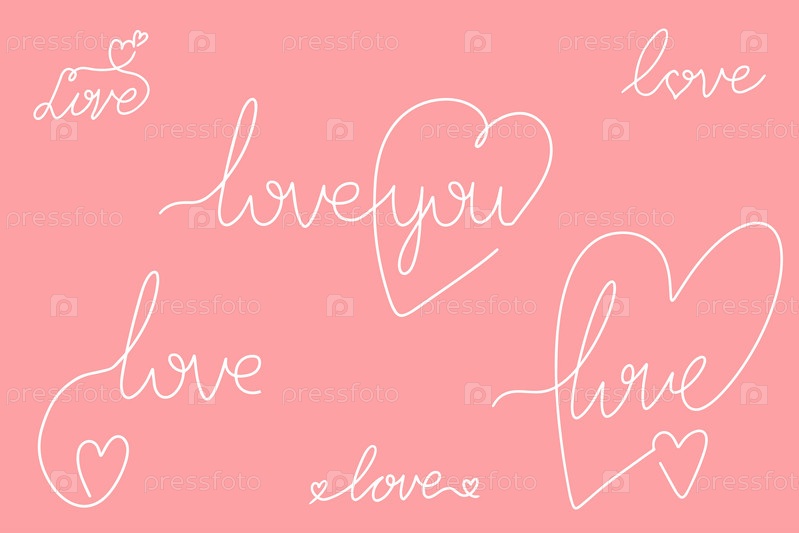 Набор любовных надписей. Непрерывный рисунок одной линией сердца и любовной надписи. Концепция Дня святого Валентина. Модная минималистская иллюстрация. Вектор