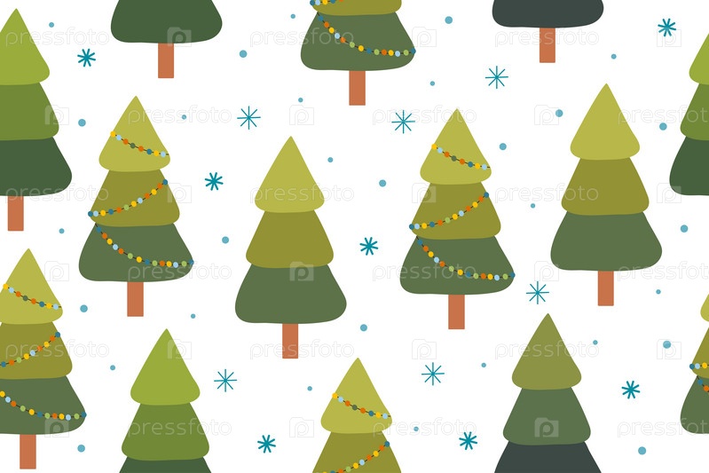 Бесшовный рождественский и новогодний узор с декоративными деревьями. Зимние и рождественские элементы на белом фоне. Подарочная упаковка, поздравительные открытки и ткань