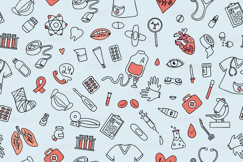 Бесшовный узор из медицинских изделий, лекарств, одежды, аптечки первой помощи в стиле каракули