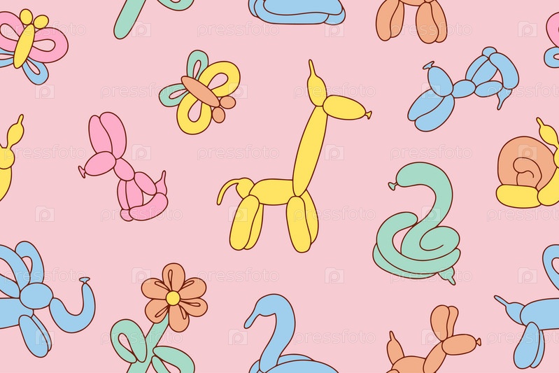 Бесшовный узор из разноцветных шаров. Красочный рисунок надувных игрушек из скрученных шаров. Элемент дизайна для упаковки, поздравительной открытки, пригласительного билета, печати, флаера, баннера. Вектор