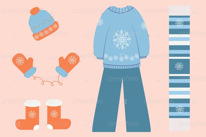 Векторный набор зимней одежды. Свитера, носки, шапка, шарф, куртка с ботинками. Комплект зимней одежды и аксессуаров