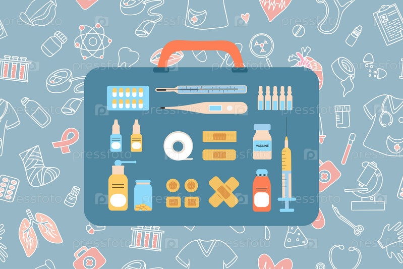 Аптечка первой помощи, предметы первой необходимости для кемпинга, охоты, походов. Комплект медицинского оборудования. Аптечка первой помощи в плоском стиле, на фоне каракулей иконок медицинских принадлежностей