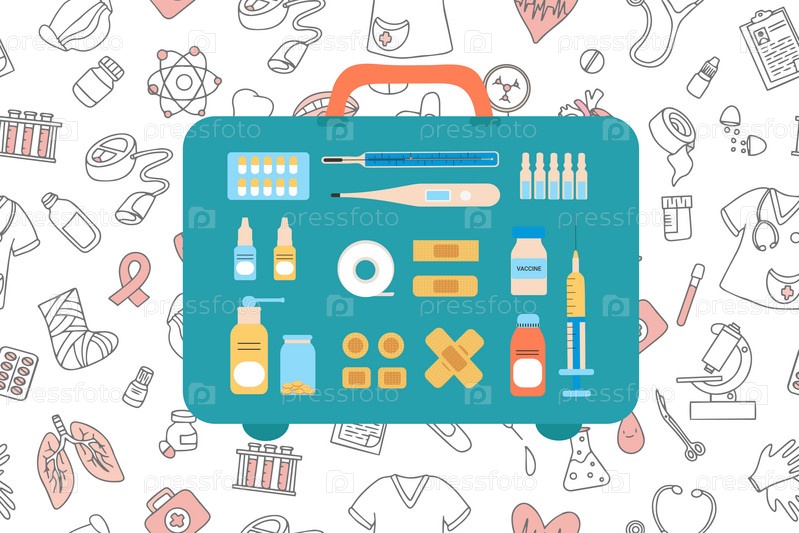 Аптечка первой помощи, предметы первой необходимости для кемпинга, охоты, походов. Комплект медицинского оборудования. Аптечка первой помощи в плоском стиле, на фоне каракулей иконок медицинских принадлежностей