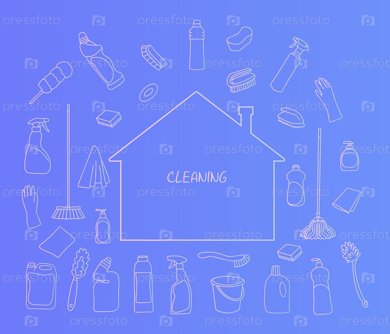 Набор уборочного инвентаря. Значки линии уборки. Линия нарисованного от руки инвентаря, чистящих средств и инструментов для мытья и дезинфекции дома, ведро и швабра, распылитель моющего средства