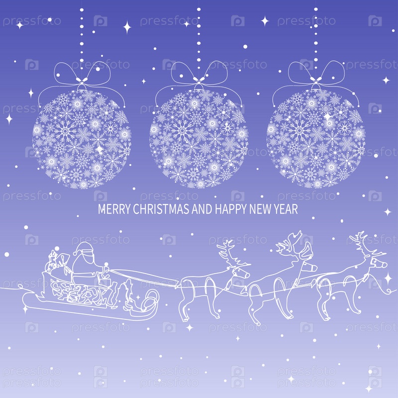 Рождественская открытка с Сантой, санями и оленями. Иллюстрация в одну линию