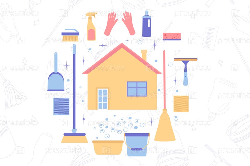 Баннер оборудования для уборки. Векторная иллюстрация. Инструменты для уборки в плоском стиле