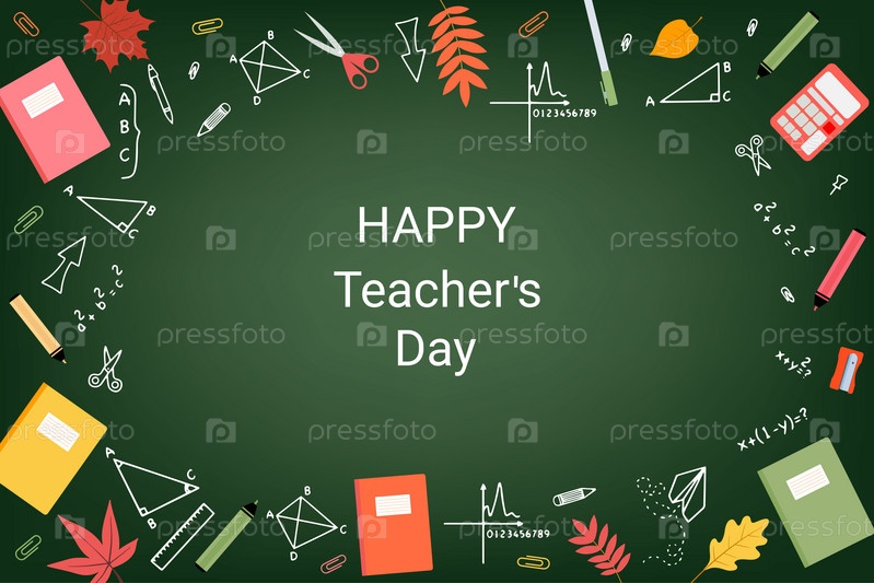 С Днем учителя - Уникальный нарисованный от руки плакат со школьными принадлежностями и уравнениями. Векторная графика. Отличные элементы дизайна типографики для поздравительных открыток, баннеров и листовок