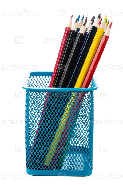 Цветные деревянные карандаши стоят ровно в синем металлическом стакане на белом фоне