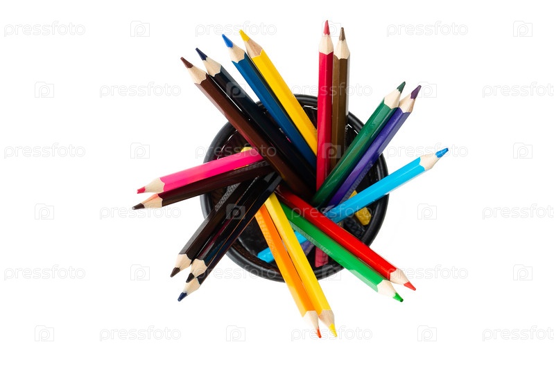 Цветные деревянные карандаши в черном металлическом стакане на белом фоне вид сверху